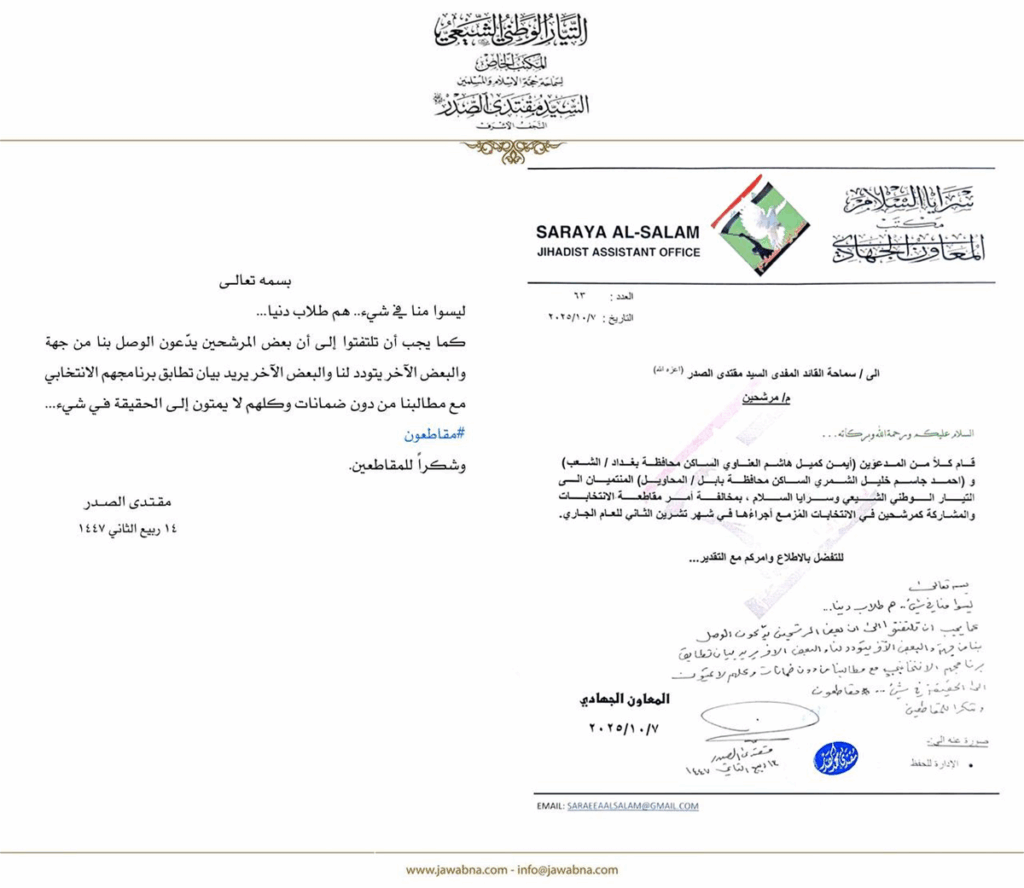 اعلن زعيم التيار الوطني الشيعي السيد مقتدى الصدر، اليوم الثلاثاء، براءته من أشخاص ينتمون إلى التيار خالفوا قرار المقاطعة وقاموا بالترشيح للانتخابات.