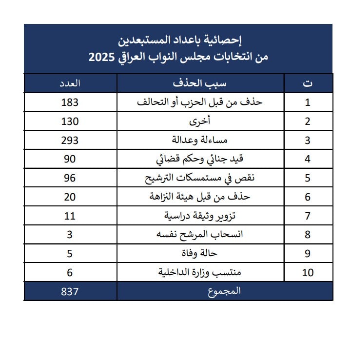 نشرت المفوضية العليا المستقلة للانتخابات، اليوم الأحد، آخر إحصائية للمستبعدين من السباق الانتخابي، فيما بلغ المجموع 837 مرشحا.