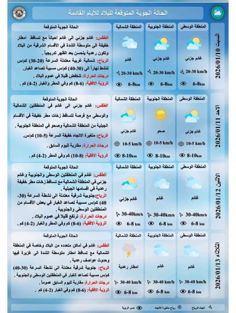 وأضافت ان “طقس يوم الاثنين سيكون غائما في المنطقتين الوسطى والجنوبية وغائما جزئيا في المنطقة الشمالية مع تساقط امطار خفيفة وعدية في الأقسام الشمالية مع تصاعد الغبار في بعض اقسام المنطقتين الوسطى والجنوبية ودرجات الحرارة ترتفع قليلا في عموم البلاد”، مشيرة الى ان “طقس يوم الثلاثاء سيكون غائما في مناطق متعددة من البلاد وخاصة الشمالية مع تساقط امطار متوسطة الشدة الى غزيرة وحدوث عواصف رعدية وتصاعد للغبار في المنطقتين الوسطى والجنوبية ودرجات الحرارة مقاربة لليوم السابق على العموم”.