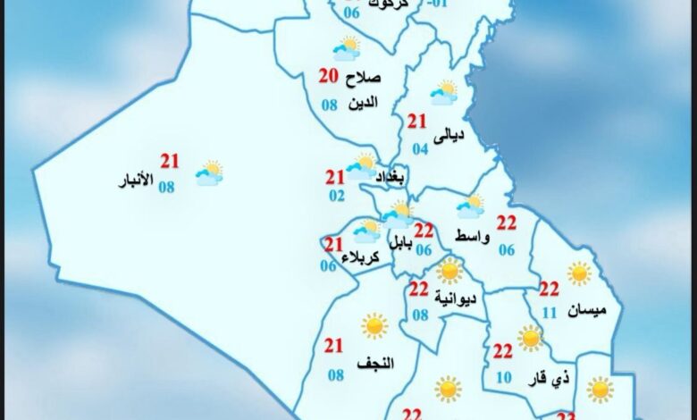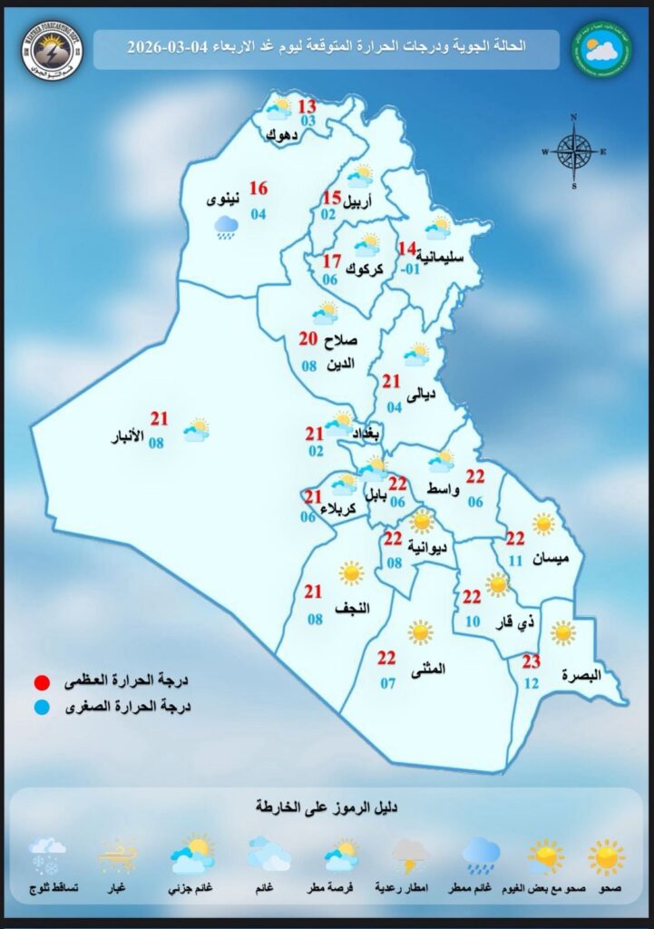 وذكر، أن “درجات الحرارة العظمى ليوم غدٍ الاربعاء ستكون في دهوك 13 السليمانية 14، وأربيل 15، نينوى 16، كركوك 17، الأنبار وصلاح الدين وديالى وبغداد وكربلاء المقدسة والنجف الاشرف 21، بابل والديوانية وواسط وميسان والمثنى وذي قار 22 والبصرة 23، اما الصغرى ستكون في البصرة 12 وبغداد واربيل 2 ودهوك 3 والسليمانية-2”.
