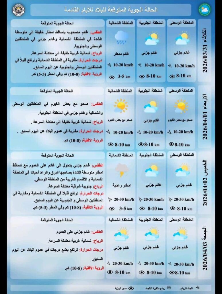 واضافت ان “طقس الاربعاء المقبل سيكون صحوا مع بعض الغيوم في المنطقتين الوسطى والشمالية وغائم جزئي في المنطقة الجنوبية ودرجات الحرارة مقاربة في عموم البلاد عن اليوم السابق”، مشيرة الى ان “طقس الخميس المقبل سيكون غائما جزئيا يتحول الى غائم على العموم مع امطار متوسطة الشدة يصاحبها البرق والرعد أحيانا في المنطقة الشمالية و الأقسام الغربية من المنطقة الوسطى ودرجات الحرارة ترتفع قليلاً في المنطقة الشمالية ومقاربة في المنطقتين الوسطى والجنوبية عن اليوم السابق”.