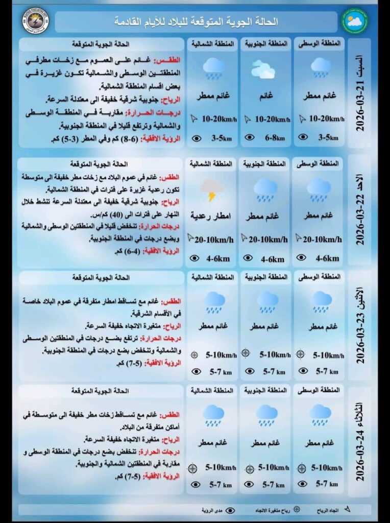 والشمالية وترتفع قليلا في المنطقة الجنوبية”، مبينة ان “طقس يوم الاحد المقبل سيكون غائما في عموم البلاد مع زخات مطر خفيفة الى متوسطة تكون رعدية غزيرة على فترات في المنطقة الشمالية، ودرجات الحرارة تنخفض قليلا في المنطقتين الوسطى والشمالية وبضع درجات في المنطقة الجنوبية”.