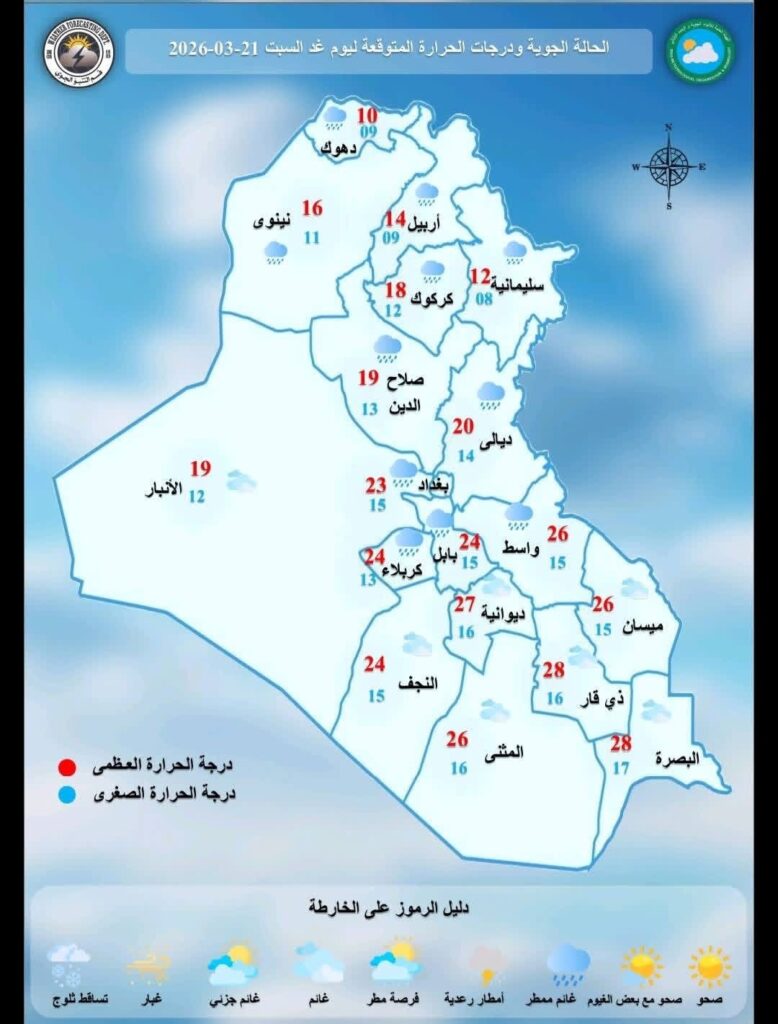 وقالت الهيئة في بيان ورد لـروافدنيوز، ان “طقس يوم غد السبت سيكون غائما على العموم مع زخات مطرفي المنطقتين الوسطى والشمالية تكون غزيرة في بعض اقسام المنطقة الشمالية، ودرجات الحرارة مقاربة في المنطقة الوسطى.
