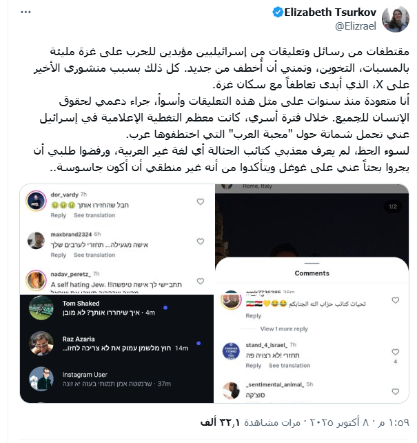 ونشرت تسوركوف جزءا من تغريدات وتعليقات الإسرائيليين المؤيدين للحرب على الغزة، مشيرة الى انها “مليئة بالمسبات والتخوين والتمنى لخطفي من جديد، وكل ذلك بسبب منشوري الأخير الذي ابدى تعاطفا مع سكان غزة”.