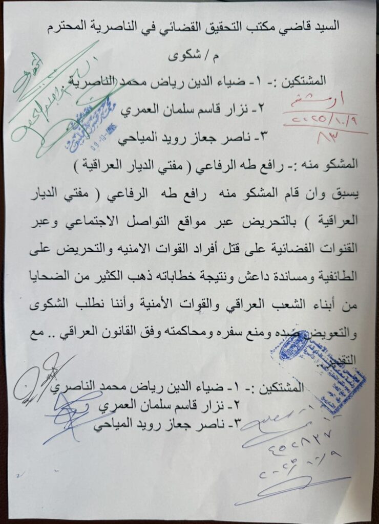وقال الناصري في بيان اطلعت عليه روافدنيوز: “نحن المتضررون من التحريض الذي قام به مفتي الديار العراقية المدعو رافع طه الرفاعي قدمنا شكوى قضائية وأصولية في محكمة استئناف ذي قار – الناصرية نتيجة الضرر الذي تسببت به خطاباته التحريضية والطائفية وتضليل الرأي العام مما نتج عن ذلك عشرات الاف الضحايا بين شهداء وجرحى ومشردين وسبايا”.