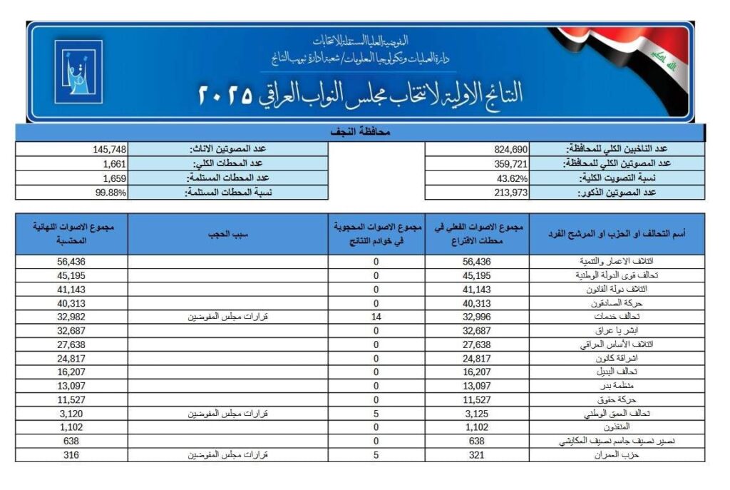 أظهرت النتائج الأولية للانتخابات التشريعية لعام 2025 في محافظة النجف تصدر ائتلاف الإعمار والتنمية قائمة القوى السياسية بحصوله على 56,436 صوتًا.