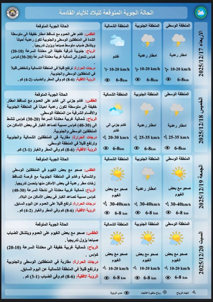 وأضافت أن “طقس يوم الخميس سيكون غائماً جزئياً إلى غائم على العموم مع تساقط أمطار خفيفة إلى متوسطة تكون رعدية أحياناً في المنطقة الجنوبية والأقسام الشرقية من المنطقة الوسطى، والرياح شمالية غربية معتدلة السرعة مسببة تصاعد الغبار في بعض الأماكن من المنطقتين الوسطى والجنوبية، ودرجات الحرارة مقاربة في المنطقتين الشمالية والجنوبية وترتفع قليلاً في المنطقة الوسطى”.