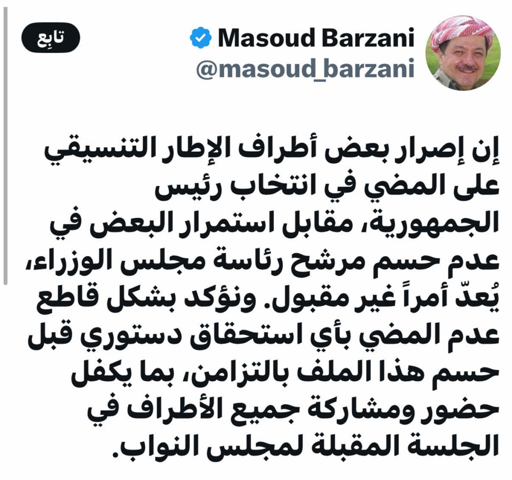 وقال بارزاني في تدوينة على منصة (X)، ان “إصرار بعض أطراف الإطار التنسيقي على المضي في انتخاب رئيس الجمهورية، مقابل استمرار البعض في عدم حسم مرشح رئاسة مجلس الوزراء، يُعد أمراً غير مقبول”.