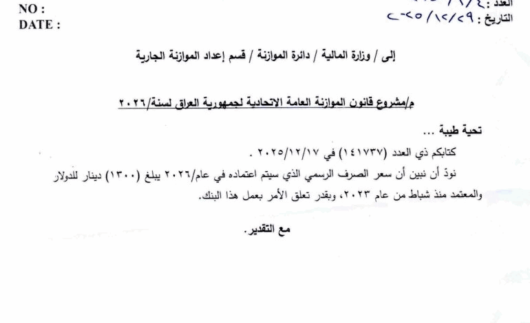 خاطب البنك المركزي العراقي، وزارة المالية بشأن سعر الصرف الرسمي للدولار الذي سيُعتمد في مشروع قانون الموازنة العامة الاتحادية لعام 2026.