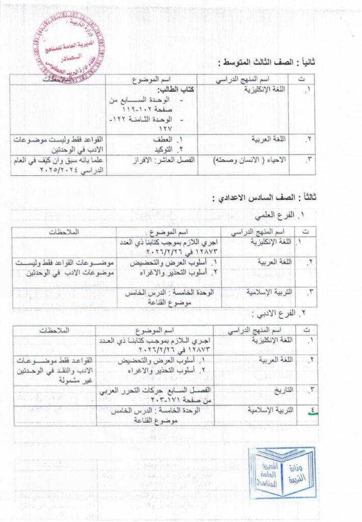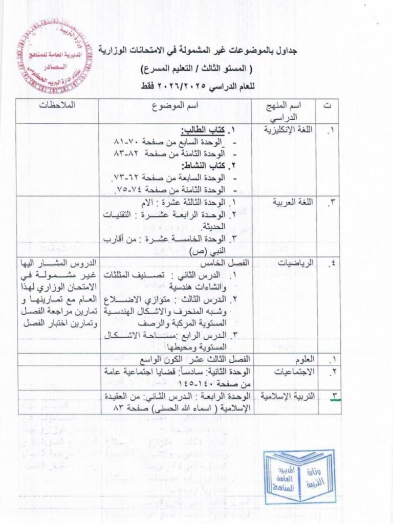 اعلنت وزارة التربية، اليوم الاربعاء، جداول الموضوعات غير المشمولة بالامتحانات الوزارية.