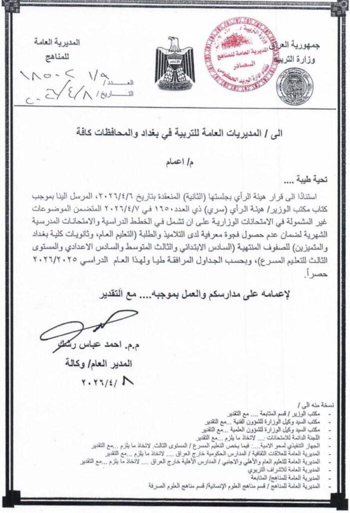 وذكرت التربية في بيان صحافي، انه “نعلن جداول الموضوعات غير المشمولة بالامتحانات الوزارية للعام الدراسي 2025–2026، الخاصة بالصفوف المنتهية (السادس الابتدائي، الثالث المتوسط، السادس الإعدادي، والمستوى الثالث للتعليم المسرّع)، ولطلبة التعليم العام وثانويات كلية بغداد والمتميزين”.
