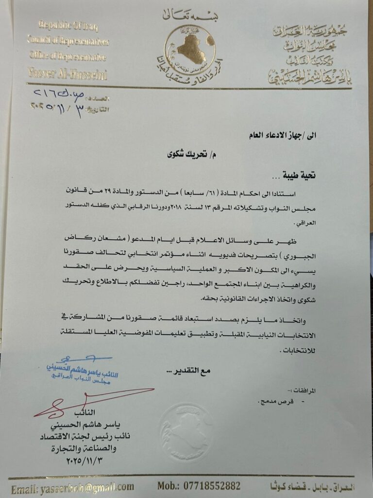 الحسيني يطالب الادعاء العام باستبعاد قائمة مشعان الجبوري من الانتخابات