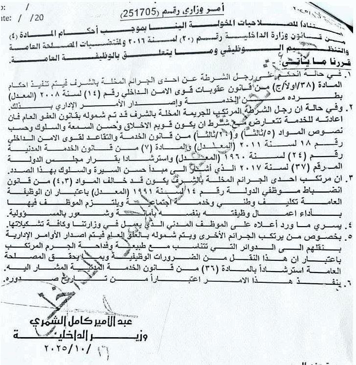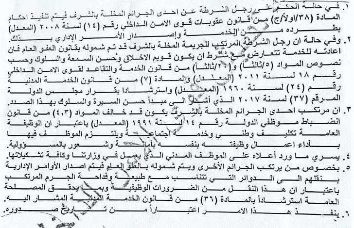واظهرت وثيقة رسمية، تحديد وزير الداخلية ضوابط إعادة المنتسبين والموظفين المدنيين في الوزارة الى الخدمة بعد شمولهم بالعفو العام، حيث اكدت الوثيقة ان المشمول بالعفو بقضية مخلة بالشرف لا يعود الى الخدمة، اما المنتسب او الموظف المشمول بالعفو العام عن جريمة أخرى غير مخلة بالشرف فتتم اعادته للخدمة ونقله الى مديرية تناسب الجرم المرتكب.
