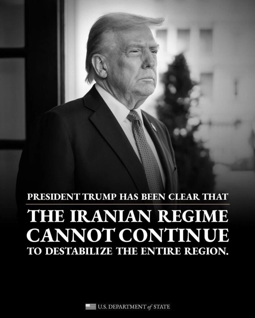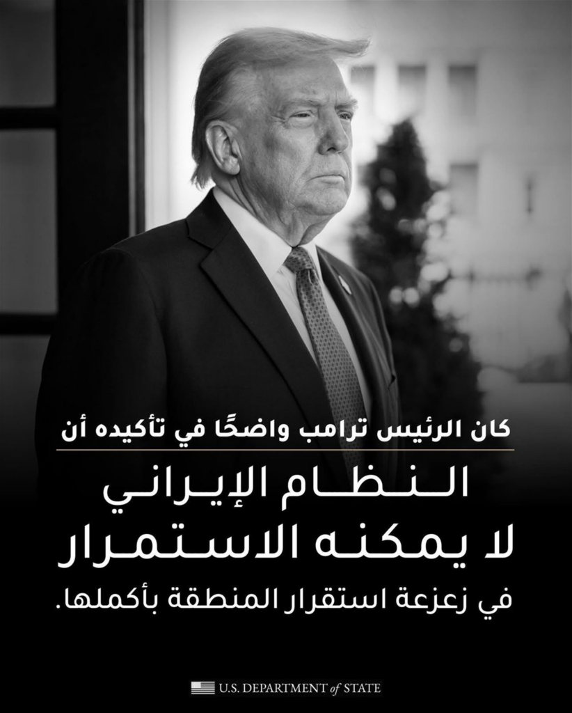 وتضمن منشور السفارة، صورتين للرئيس ترامب باللغتين العربية والإنكليزية مدونة في داخلها عبارة “كان الرئيس ترامب واضحا في تأكيده ان النظام الإيراني لا يمكنه الاستمرار في زعزعة استقرار المنطقة بأكملها”.