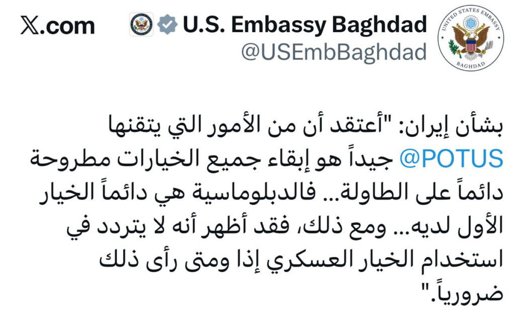 اكدت السفارة الأميركية في بغداد، اليوم الثلاثاء، ان الرئيس دونالد ترامب لن يتردد في استخدام الخيار العسكري بشأن ايران.