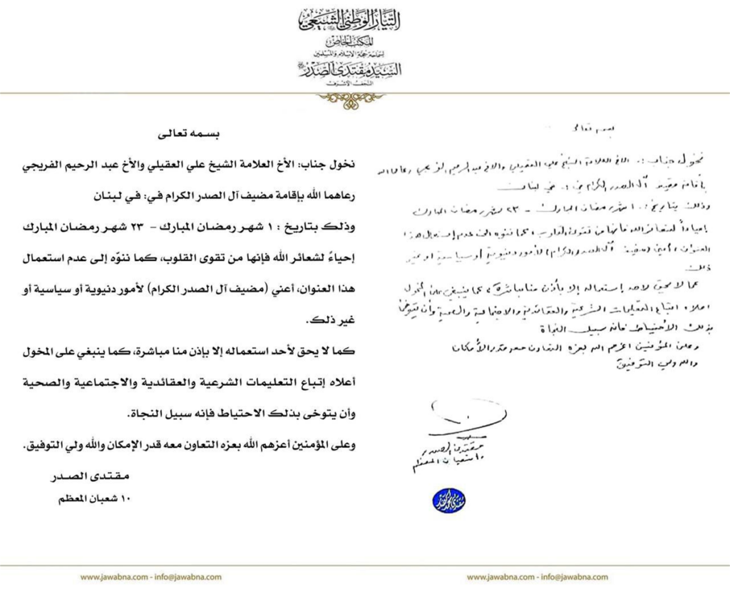 وقال السيد الصدر في بيان، “نخول جناب الاخ العلامة الشيخ علي العقيلي والاخ عبد الرحيم الفريجي رعاهما الله باقامة مضيف ال الصدر الكرام في لبنان بتاريخ 1 رمضان – 23 رمضان، احياء لشعائر الله فانها من تقوى القلوب”، منوهاً إلى “عدم استعمال هذا العنون اعني (مضيف ال الصدر الكرام) لامور دنيوية او سياسية او غير ذلك”.