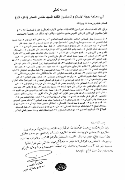 الصدر يتسلم قائمة جديدة لـ “مخالفي المقاطعة”: اعلان براءة من 78 مرشحا