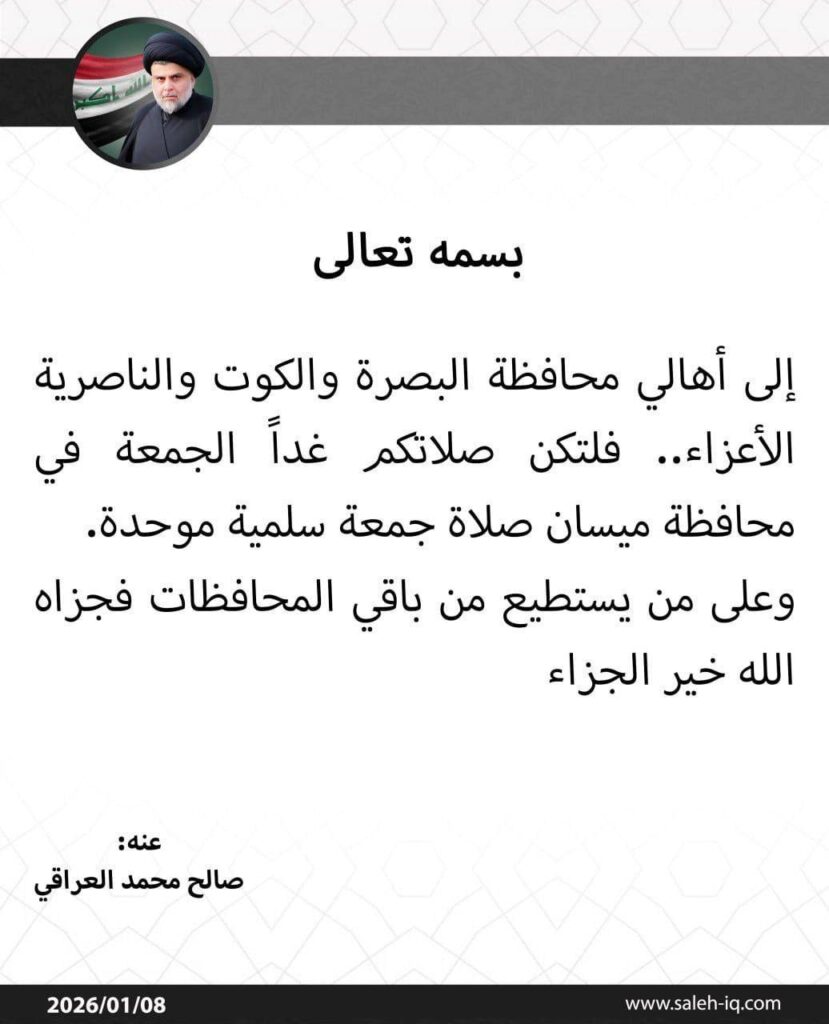 ونشر وزير القائد، صالح محمد العراقي، تدوينة، نقلاً عن السيد الصدر، أنه “إلى أهالي محافظة البصرة وذي قار وواسط، فلتكن صلاتكم غداً الجمعة في محافظة ميسان صلاة جماعية سلمية موحدة”.