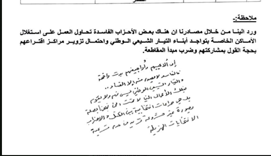 وجاء في وثيقة نشرها مكتب الصدر، خلاصة رصد قدمت الى السيد الصدر، من بينها، ان الفاسدين يعملون على استغلال الأماكن التي يتواجد فيها أبناء التيار الوطني الشيعي وتزوير مراكزها الانتخابية بحجة القول بمشاركتهم وضرب مبدأ المقاطعة.