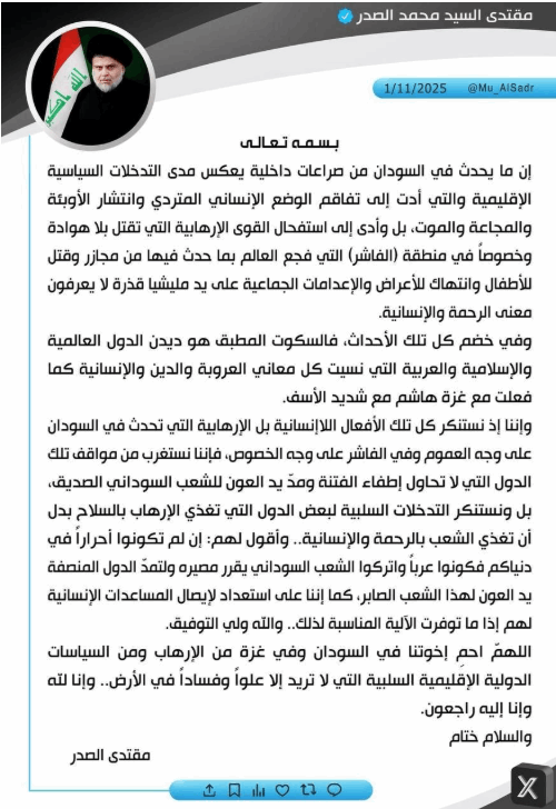 وقال الصدر في تغريدة تابعتها، إن “ما يحدث في السودان من صراعات داخلية يعكس مدى التدخلات السياسية الإقليمية والتي أدت إلى تفاقم الوضع الإنساني المتردي وانتشار الأوبئة والمجاعة والموت، بل وأدى إلى استفحال القوى الإرهابية التي تقتل بلا هوادة وخصوصاً في منطقة (الفاشر) التي فجع العالم بما حدث فيها من مجازر وقتل للأطفال وانتهاك للأعراض والإعدامات الجماعية على يد مليشيا قذرة لا يعرفون معنى الرحمة والإنسانية”.