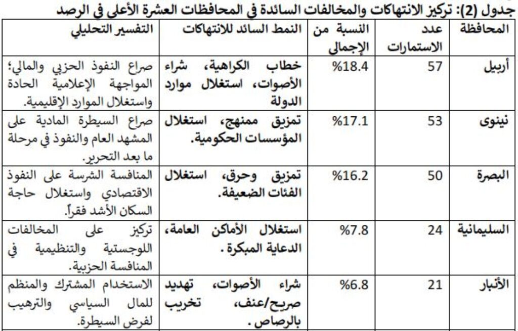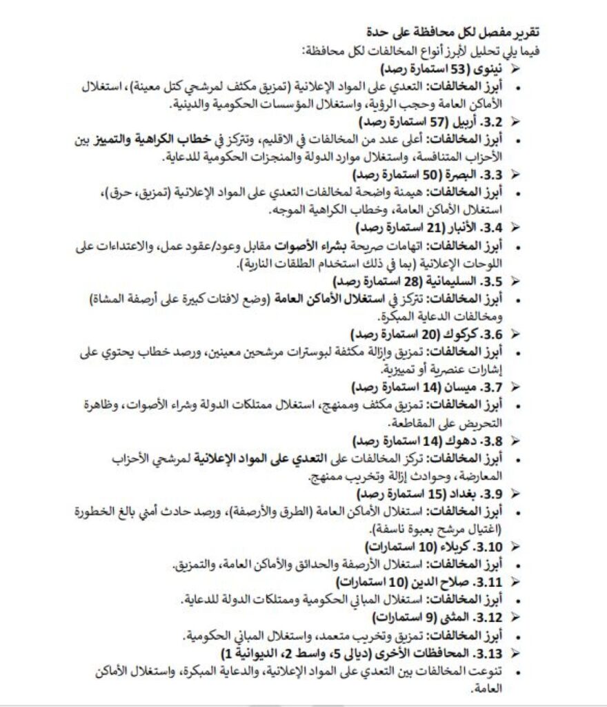 كما سلّط التحالف في تقريره، الضوء على الانتهاكات في المحافظات العراقية العشرة الأعلى في الرصد، والتي تنوعت بين “تمزيق بوسترات دعائية، وحرق، واستغلال الفئات الضعيفة، والدعاية المبكرة، وتهديد صريح، وعنف وتخريب، واستغلال المباني الحكومية”: