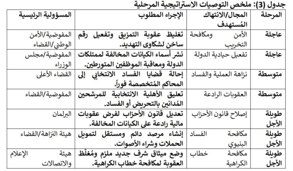 كما أوصى التحالف، بـ”إجراءات متوسطة الأجل للمحاسبة القضائية”، مبيناً “حيث يتعين على القضاء الأعلى إنشاء هيئة تحقيق قضائية متخصصة بالفساد الانتخابي لضمان إحالة قضايا شراء الأصوات والرشوة إلى المحاكم المختصة بسرعة، ويتم تعليق الأهلية الانتخابية أو حرمان المرشحين والكيانات المدانة في هذا الإطار”.