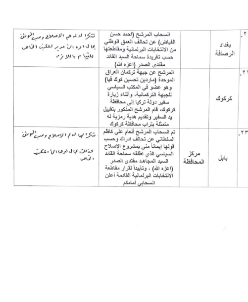 من جانبه، وجه السيد الصدر بإحالة امر هؤلاء المرشحين المنسحبين الى المكتب الخاص وتقديم الشكر لهم.