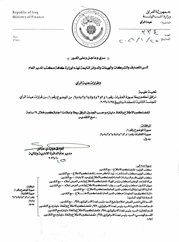 خاطبت وزارة المالية، اليوم الثلاثاء، دوائر الدولة بتخفيض الإيفاد 90% وتقليص وقود السيارات 50%.