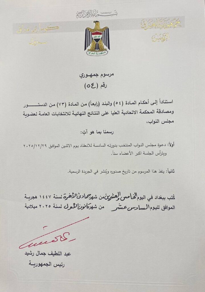 وجاء في المرسوم الجمهوري الصادر اليوم، انه “استناداً إلى أحكام المادة (54) والبند (رابعاً) من المادة (73) من الدسـتور ومصادقة المحكمة الاتحادية العليا على النتائج النهائية للانتخابات العامة لعضوية مجلس النواب، رسمنا بما هو آت: