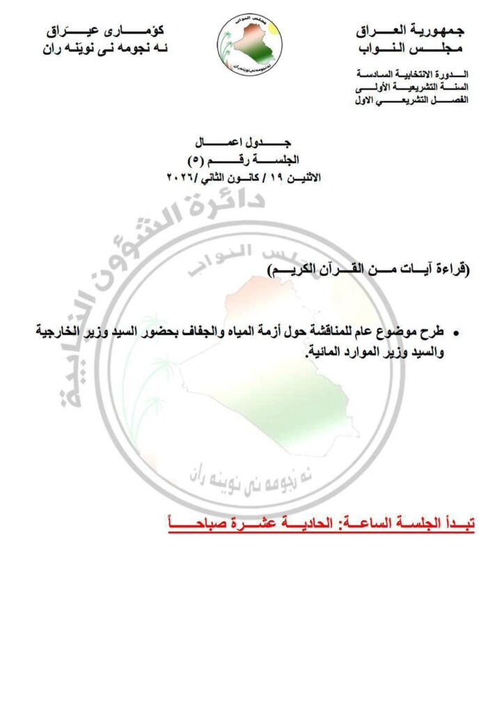وبحسب جدول أعمال مجلس النواب، فإن الجلسة الخامسة ستعقد يوم الاثنين 19 كانون الثاني 2026، عند الساعة الـ11 صباحاً؛ لمناقشة موضوع أزمة المياه والجفاف، بحضور وزير الخارجية ووزير الموارد المائية.