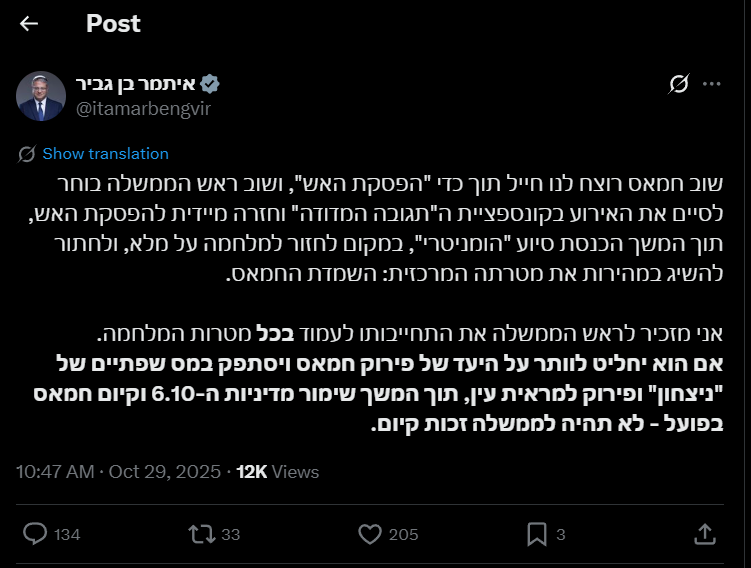 وأضاف: “أذكر رئيس الوزراء بالتزامه بتحقيق جميع أهداف الحرب، إذا قرر التخلي عن هدف تفكيك حماس، واكتفى بالشعارات الظاهرية بتفكيكها، مع استمراره في الحفاظ على سياسة 6.10 ووجود حماس عمليا، فلن يكون للحكومة أي حق في الوجود”.