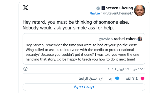 شهدت منصة “إكس” سجالا حادا بين ريتشيل كوهين مديرة اتصالات السيناتور الديمقراطي مارك وارنر، وستيفن شوينغ مساعد الرئيس الأمريكي دونالد ترامب.