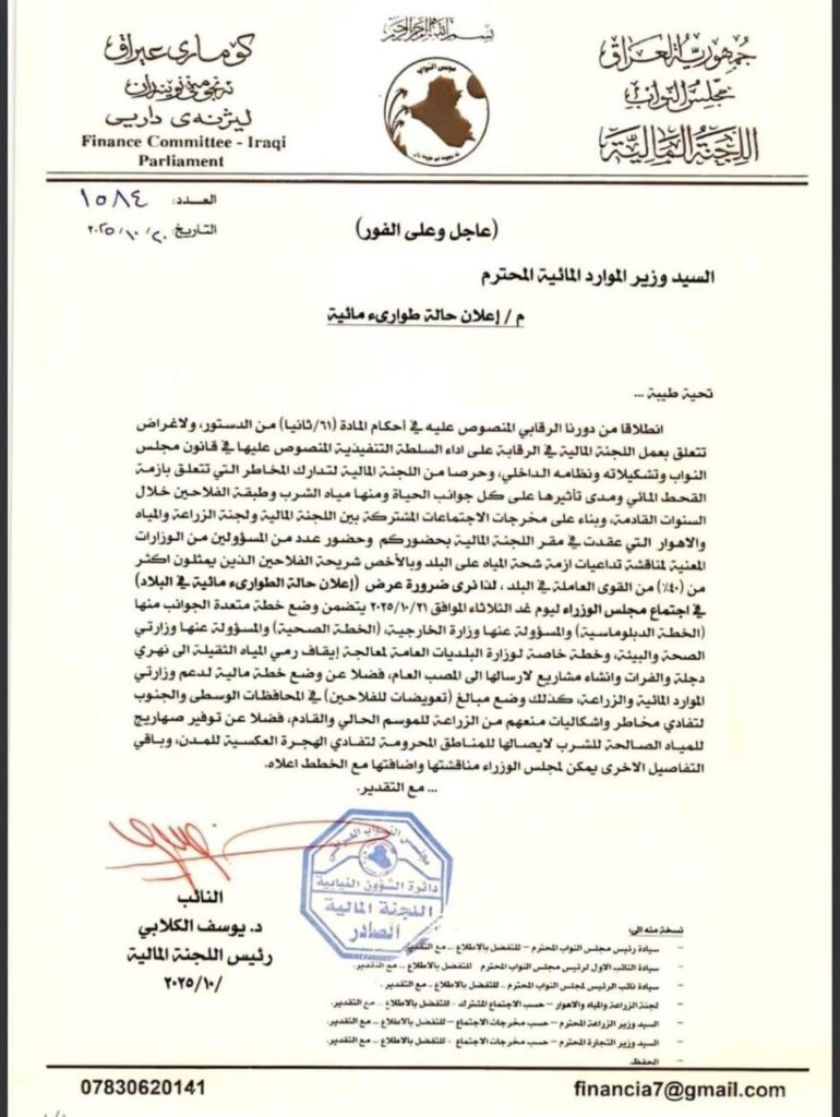 النواب وتشكيلاته ونظامه الداخلي، وحرصا من اللجنة المالية لتدارك المخاطر التي تتعلق بأزمة القحط المائي ومدى تأثيرها على كل جوانب الحياة ومنها مياه الشرب وطبقة الفلاحين خلال السنوات القادمة، وبناء على مخرجات الاجتماعات المشتركة بين اللجنة المالية ولجنة الزراعة والمياه والاهوار التي عقدت في مقر اللجنة المالية بحضوركم وحضور عدد من المسؤولين من الوزارات المعنية لمناقشة تداعيات أزمة شحة المياه على البلد وبالأخص شريحة الفلاحين الذين يمثلون اكثر من 40 بالمئة من القوى العاملة في البلد، نرى ضرورة عرض إعلان حالة الطوارىء مائية في البلاد )في اجتماع مجلس الوزراء ليوم غد الثلاثاء الموافق 21 تشؤرين الأول 2025، يتضمن وضع خطة متعدة الجوانب منها الخطة الدبلوماسية والمسؤولة عنها وزارة الخارجية ( الخطة الصحية) والمسؤولة عنها وزارتي الصحة والبيئة، وخطة خاصة لوزارة البلديات العامة لمعالجة إيقاف رمي المياه الثقيلة الى نهري دجلة والفرات وانشاء مشاريع لارسالها الى المصب العام، فضلا عن وضع خطة مالية لدعم وزارتي الموارد المائية والزراعة”.