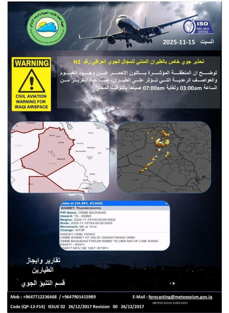 أصدرت هيئة الأنواء الجوية، اليوم السبت، تحذيرا بشأن الطيران المدني بالمجال الجوي العراقي.