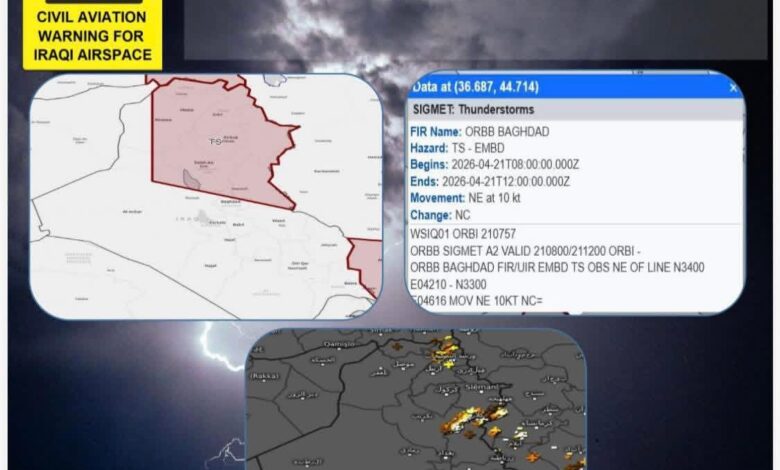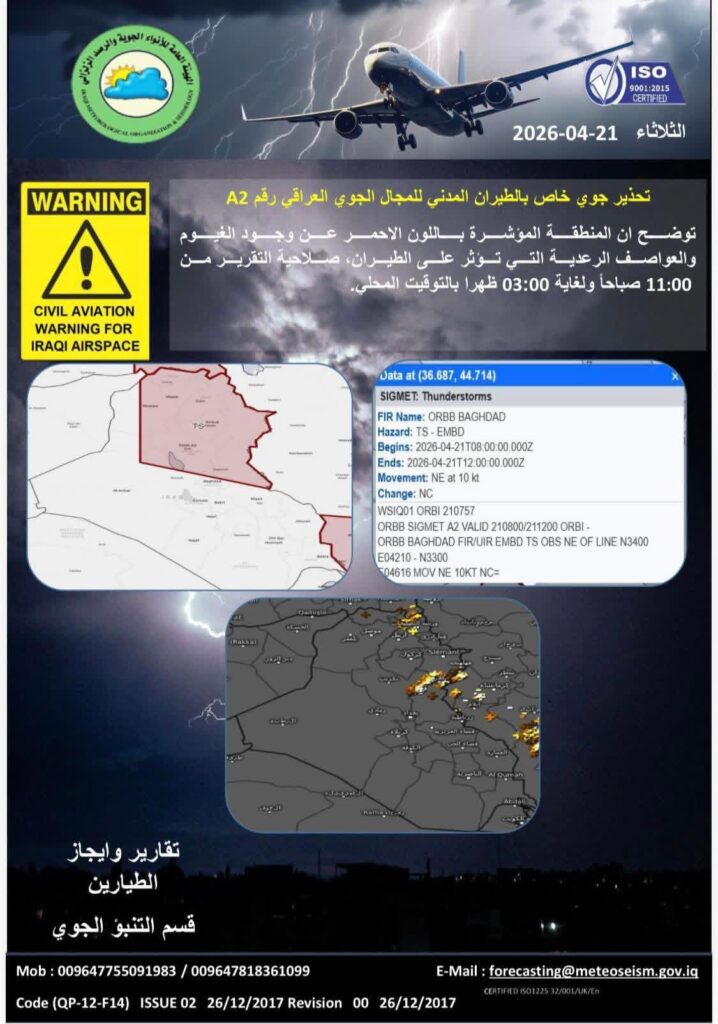 وقالت الهيئة في بيان صحافي، “نحذر الطيران المدني في المجال الجوي العراقي رقم A2 ان المنطقة المؤشرة باللون الاحمر تشهد وجود الغيوم والعواصف الرعدية التي تؤثر على الطيران”.