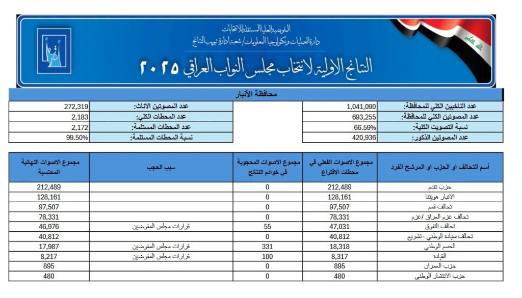 أظهرت النتائج الأولية للانتخابات التشريعية لعام 2025 في محافظة الأنبار تصدّر تحالف تقدم المشهد الانتخابي بعد حصوله على 212,489 صوتًا، متقدّمًا بفارق واسع على أقرب منافسيه.