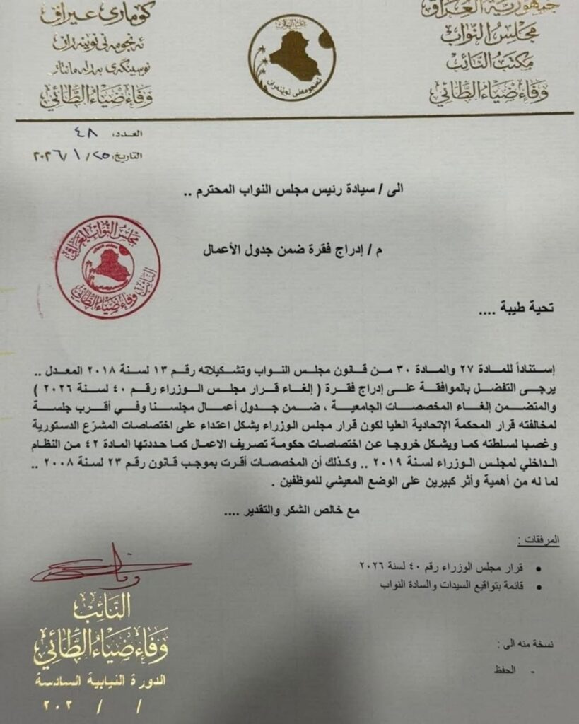 ووفقاً لكتاب رسمي وجهته النائب الطائي إلى رئاسة مجلس النواب بتاريخ 25 كانون الثاني 2026، فإن المطالبة بإدراج فقرة إلغاء القرار ضمن جدول أعمال المجلس تستند إلى مبررات قانونية عدة، أبرزها مخالفة المحكمة الاتحادية، إذ اعتبر الطلب أن قرار مجلس الوزراء يُعد مخالفة لقرار المحكمة الاتحادية العليا، ويشكل اعتداءً على اختصاصات المشرع الدستوري.