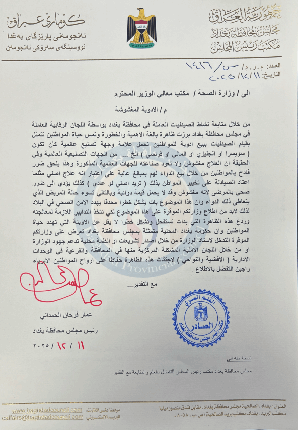 وفي كتاب رسمي موجه إلى وزارة الصحة، يتناول ملف متابعة نشاط الصيدليات العاملة في بغداد، قال الحمداني، أن متابعة نشاط الصيدليات كشفت عن وجود ظاهرة بالغة الأهمية والخطورة تتمثل في قيام صيدليات ببيع أدوية للمواطنين تحمل علامات عالمية (قد تكون سويسرا أو إنجلترا أو ألمانيا أو فرنسا)، وهي في الحقيقة “علاج مغشوش”.