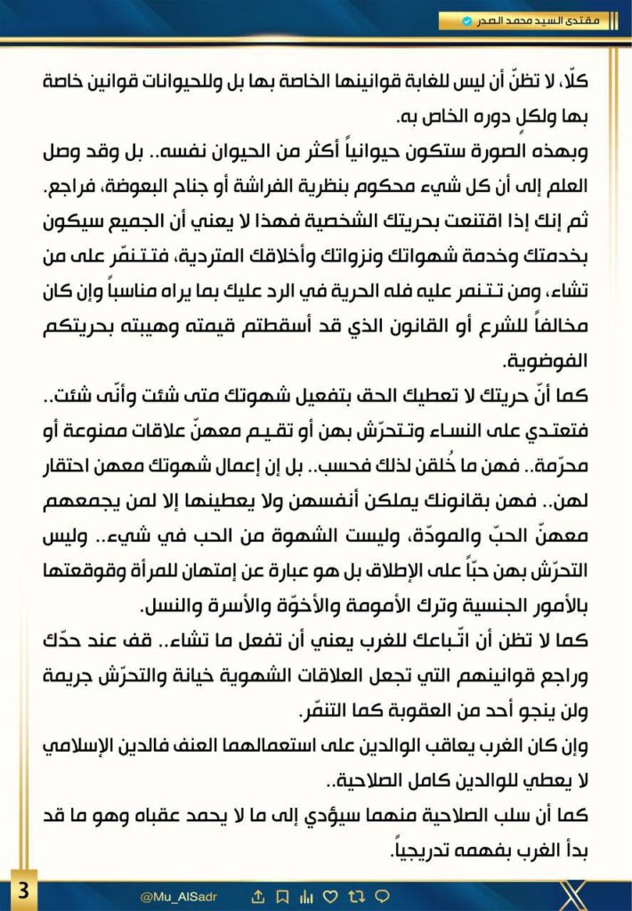 وجه زعيم التيار الوطني الشيعي، السيد مقتدى الصدر، اليوم الخميس، رسالة الى فئة من الشباب (المتحررين)، فيما أشار الى ان افعالهم ستؤدي بيهم الى سقوط كل الأديان والقوانين، وسيجعلهم يعيشون في غابة.