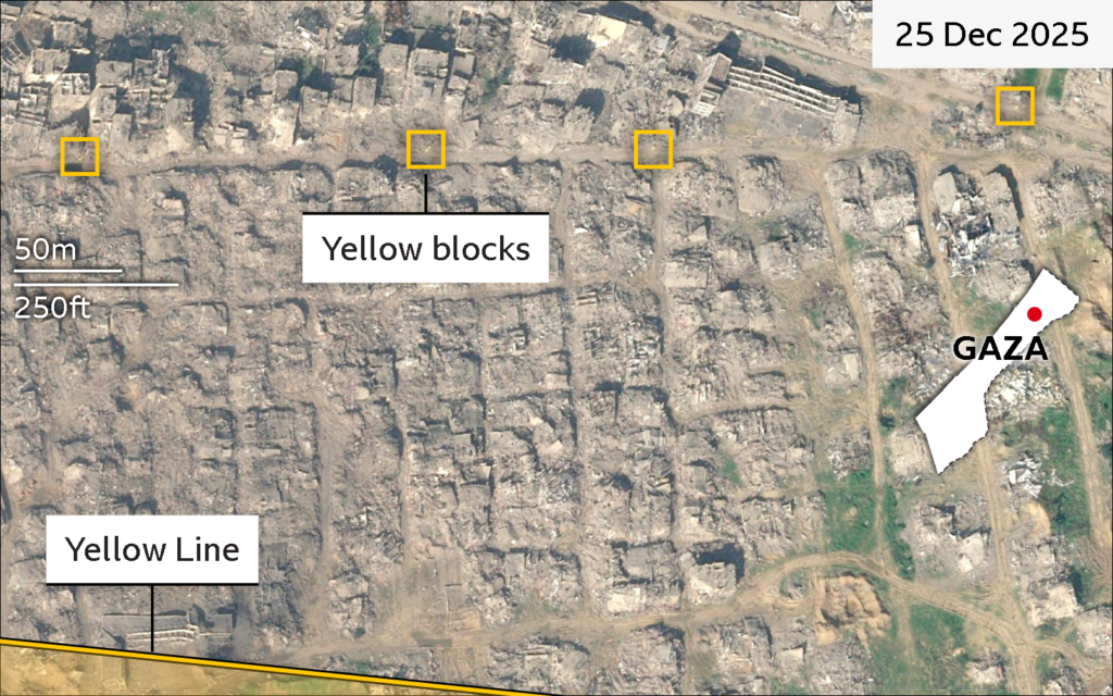 وأظهرت صور التقطتها أقمار صناعية في 2 و13 ديسمبر 2025 نقل الكتل الخرسانية المقصودة لتحديد “الخط الأصفر” بحوالي 200 متر داخل المناطق الخاضعة لسيطرة حماس، تلاها هدم 40 مبنى على الأقل، حيث أصبح الحي فارغا.