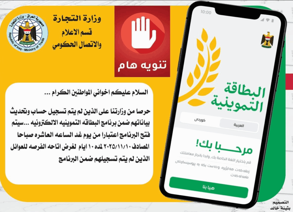 وأكدت الوزارة أن “هذه الخطوة تأتي حرصاً على إتاحة الفرصة للعوائل التي لم تسجل أو تحدث بياناتها ضمن برنامج البطاقة التموينية الإلكترونية، بهدف ضمان دقة المعلومات واستمرار شمول جميع المستحقين ضمن النظام الإلكتروني الجديد”.