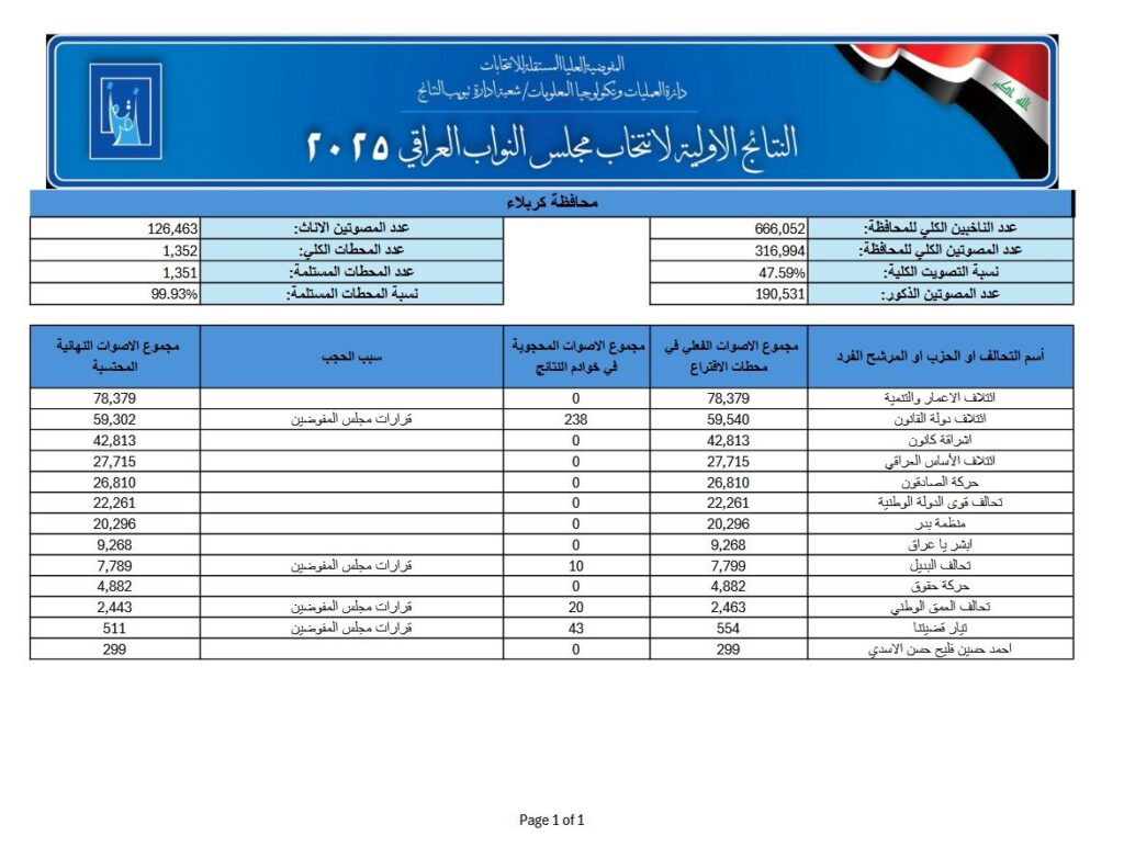 أظهرت النتائج الأولية للانتخابات التشريعية لعام 2025 في محافظة كربلاء تفوّق ائتلاف الإعمار والتنمية الذي تصدّر الترتيب بحصوله على 78,379 صوتًا.