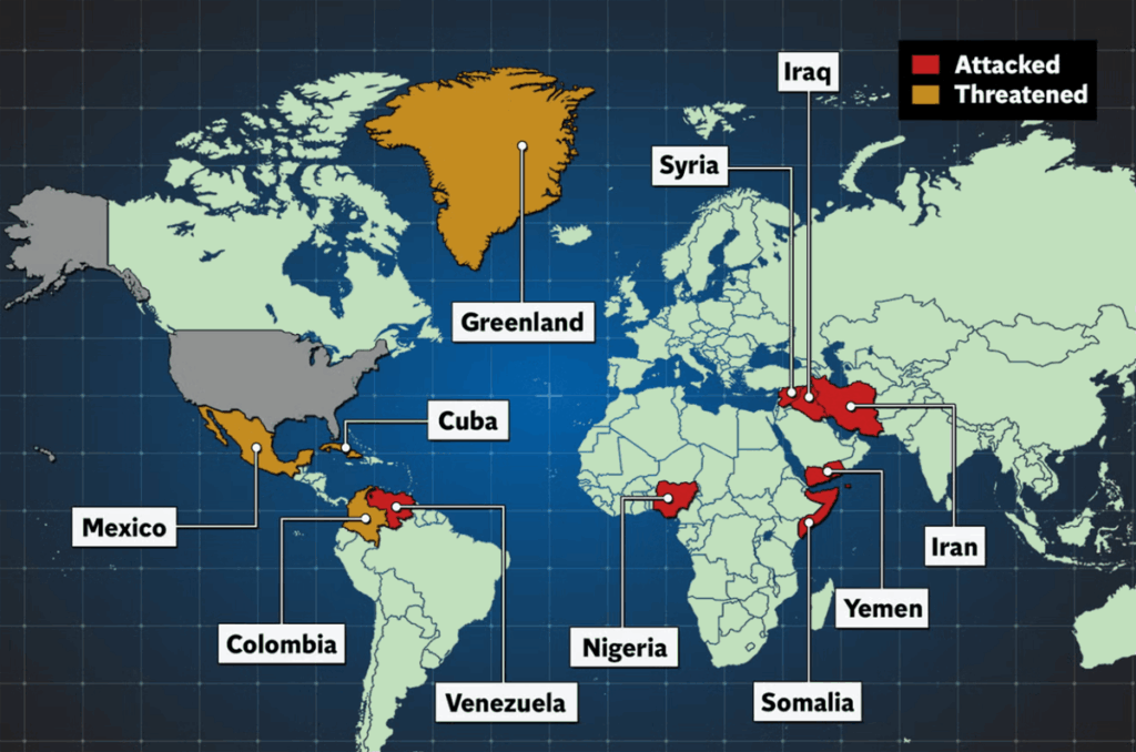 تتبع تقرير بريطاني، البلدان التي هاجمها ترامب او قام بتهديدها منذ بدء ولايته الثانية او ما باتت تعرف بولاية “أمريكا أولا”، حيث ان من المفارقات كان من المفترض ان شعاره “لنجعل أمريكا عظيمة مرة أخرى”، تعني بالضرورة الانكفاء الى الداخل وعدم التدخل بشؤون البلدان الأخرى لكن ما حدث هو عكس ذلك تماما.