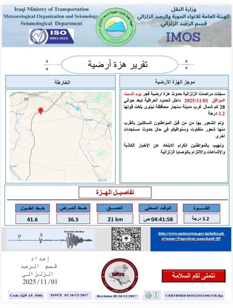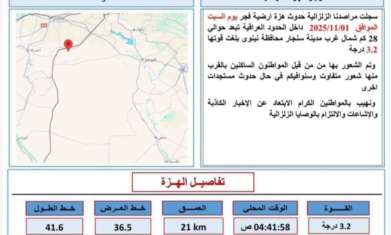 وذكر القسم في بيان صحافي، انه “تم تسجيل هزة أرضية بقوة (3,2) في شمال غرب مدينة سنجار نينوى”.