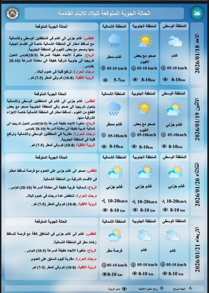 واضافت أن “طقس الثلاثاء القادم سيكون صحواً إلى غائم جزئياً على العموم مع فرصة تساقط امطار في الاقسام الشرقية من المنطقة الشمالية، ودرجات الحرارة تنخفض عدة درجات في عموم البلاد”، لافتة الى ان “طقس الأربعاء المقبل سيكون غائماً إلى غائم جزئياً في المناطق كافة، مع فرصة لتساقط زخات مطر في المنطقة الشمالية، ودرجات الحرارة مقاربة لليوم السابق على العموم”.