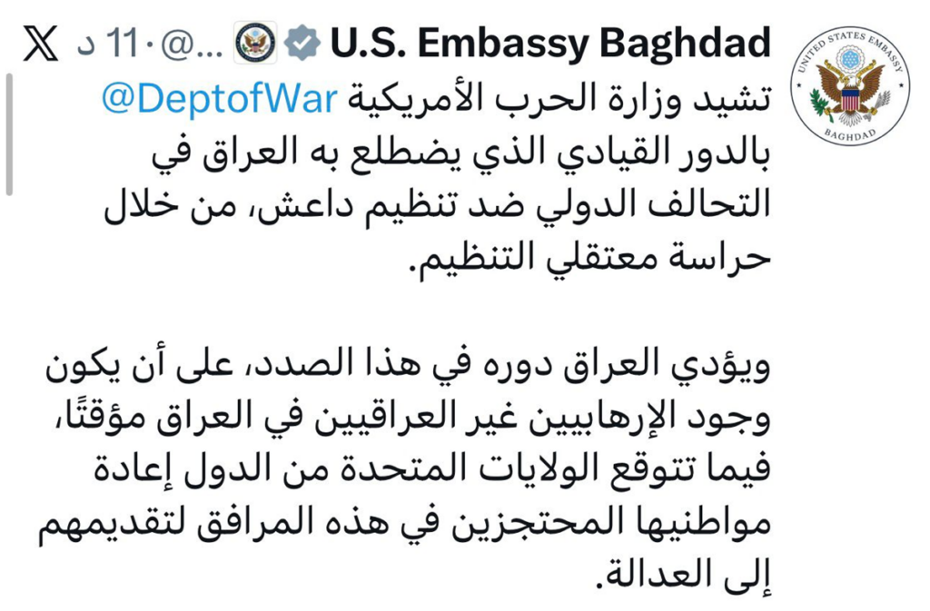 وقالت السفارة الأميركية ببغداد في منشور على صفحتها الرسمية بمنصة X وتابعته السومرية نيوز، ان “وزارة الحرب الأمريكية تشيد بالدور القيادي الذي يضطلع به العراق في التحالف الدولي ضد تنظيم داعش، من خلال حراسة معتقلي التنظيم”.